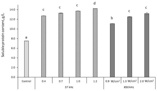 Changes in soluble protein content in corn steep liquor (CSL) samples after low- (37 kHz) and high frequency (850 kHz) ultrasound treatment at different intensities (40%, 70%, 100%, and 120%–37 kHz and 0.9, 1.3, and 2.0 W/cm2–850 kHz) for 30 min at 50 °C, pH 9.0. Data expressed as a mean value (n = 3) ± SD; SD—standard deviation; a–d means with different letters are significantly different (p < 0.05).