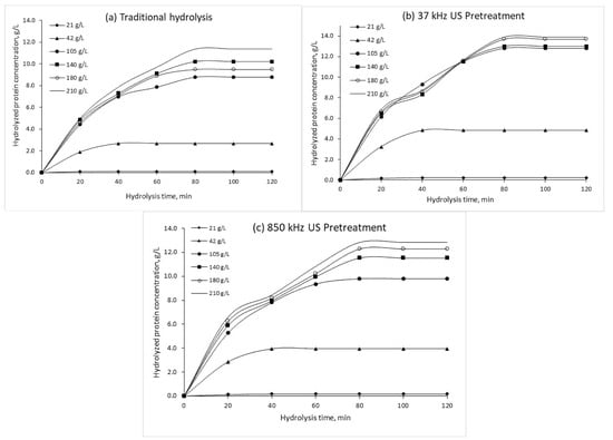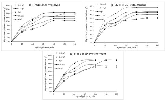 Hydrolyzed protein concentrations obtained by traditional hydrolysis (a), 37 kHz US pre-treated hydrolysis (b) and 850 kHz pre-treated hydrolysis (c) at different protein concentrations (E0 = 1.05 g/L, pH = 9.0, T = 70 °C). US—ultrasound treatment.