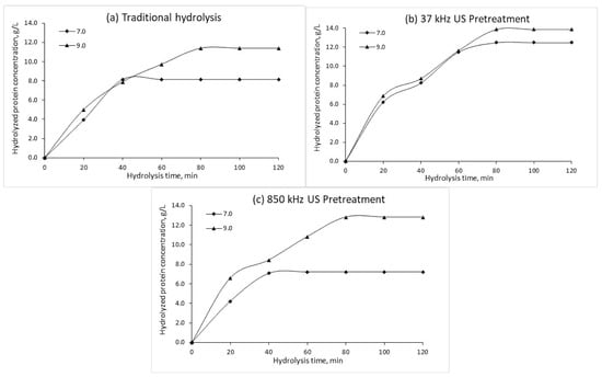 Hydrolyzed protein concentrations obtained by traditional hydrolysis (a), 37 kHz US pre-treated hydrolysis (b) and 850 kHz pre-treated hydrolysis (c) at different pH (C0 = 210 g/L, E0 = 1.05 g/L, T = 70 °C). US—ultrasound treatment.