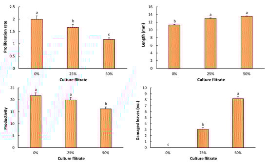 Proliferation rate, elongation, productivity, and number of damaged leaves in shoots of the mandarin cv. ‘Fortune’ exposed to different percentages of culture filtrate of Alternaria alternata. Data represent average ± SD values. Bars with different lower-case letters indicate a significant difference according to the LSD test (p ≤ 0.05).