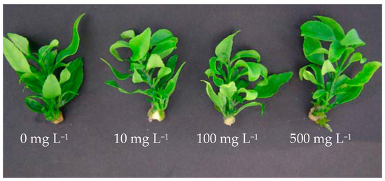 Regarding the ACT application to in vivo leaves, results were similar to those obtained with the ACT addition to the culture media, so there were no effects. Thus, after four weeks of culture, no significant differences were found between leaves in shoots grown in the control vessels (0 mL L−1 of ACT) and the rest of the treatments (Figure 2; data not shown).