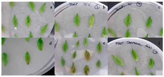 Excised and wounded leaves of the mandarin ‘Fortune’ exposed to 0 (a), 12.5 (b), 25 (c), 50 (d), and 75 (e) mg L−1 of Alternaria citri toxin and acetonitrile (f).