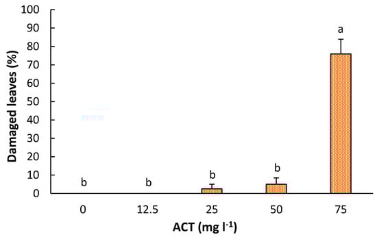 Direct application of ACT in the ‘Fortune’ wounded excised leaves has a significant effect (p < 0.0001) over the percentage of damaged leaves. The mycotoxin caused a significant damage when the concentration of the ACT was 75 mg L−1 (Figure 3 and Figure 4). At this concentration, almost 80% of the leaves per shoot were damaged. Although some leaves were damaged at 25 and 50 mg L−1 of ACT, no significant differences were found between these two treatments and the control.