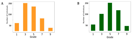 Phenotypic distributions of 688 soybean germplasm responses to enhanced UV-B radiation. (A) Damage of Leaf Chlorosis (B) Damage of Leaf Shape. Grade 1: same degree of damage with resistant soybean (GCS731). Grade 7: same degree of damage with susceptible soybean (Daepung).