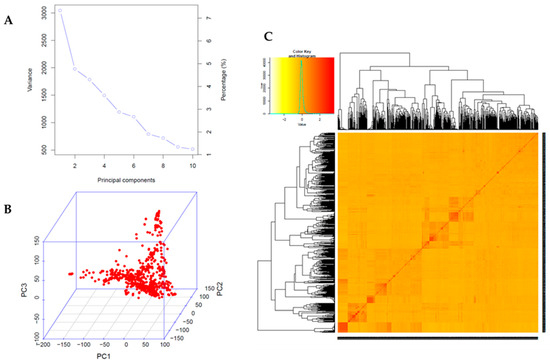 Population structure analysis of 688 soybean germplasm collection. (A) Variance of first 10 principal components reflected by 65,762 SNPs used in the GWAS. (B) Principal component analysis (PCA) of 65,762 SNPs indicating the population structure of 688 soybean accessions. (C) A heatmap of kinship matrix presenting genetic relatedness of 688 soybean accessions.