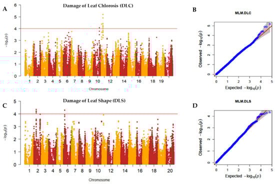 Manhattan plots and quantile–quantile (QQ) plots of UV-B resistance traits. The upper red lines of the Manhattan plots indicate the threshold (-log(p) = 4) for significant SNPs (FDR-unadjusted p-value < 0.0001) (A) Manhattan plot for DLC (Damage of Leaf Chlorosis); (B) QQ plot for DLC; (C) Manhattan plot for DLS (Damage of Leaf Shape); (D) QQ plot for DLS.