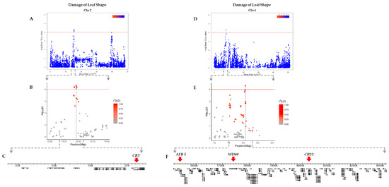 Identification of candidate genes associated with DLS (Damage of Leaf Shape) on chromosomes 2 and 6. (A) Manhattan plot of chromosome 2 with the threshold (-log(p) = 4) for significant SNPs. (B) Scatter plot centered on AX-90334094 with r2 (LD) values. (C) Gene models presented within the LD block region. The candidate genes for UV-B resistance are marked with red arrows. (D) Manhattan plot of chromosome 6 with the threshold (-log(p) = 4) for significant SNPs. (E) Scatter plot centered on AX-90333167 with r2(LD) values. (F) Gene models present within the LD block region. The candidate genes for UV-B resistance are marked with red arrows.