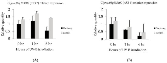 Comparisons of gene expression levels between susceptible “Daepung” and resistant “GCS731” under UV-B irradiation of 0, 1, and 6 h. (A) Relative expression levels of Glyma.06g103200 encoding cryptochrome (CRY1). (B) Relative expression levels of Glyma.06g095400 encoding Auxin F-box 5 (AFB5).