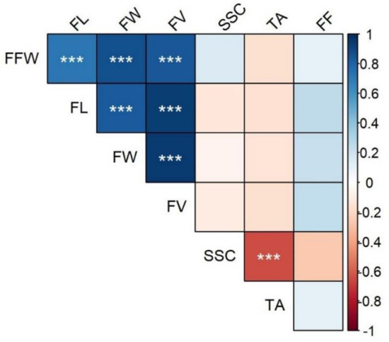 Correlogram (Pearson) of the quantitative variables of the fruits. Pairwise correlations between variables (see Table 2. for the code) are colour-mapped according to the colour scale of the bar on the right-hand side. Asterisks indicate statistically significant correlations (***: p < 0.001).
