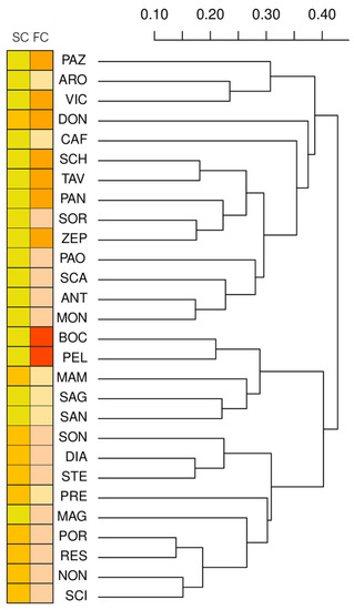 To visualize the relationships among the apricot landraces under investigation, we performed a multivariate cluster analysis using both qualitative and quantitative traits. At a high hierarchical node (k = 2), the top cluster (PAZ-MON) was associated with a yellowish skin colour (13 varieties out of 14), while the bottom (BOC-SCI) mainly with the light orange one (9 out of 14) (Figure 2).