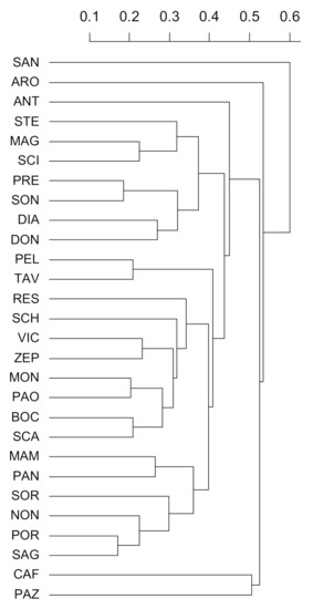 Tree vigour was visually evaluated in the field and assigned to one of the following categories: very weak, weak, medium, strong, very strong, according to the document TG/70/4 Rev. (proj.2) of the International Union for the Protection of new Varieties of Plants (UPOV, Geneva, Switzerland). Not available (NA) was assigned in the cases of off-types and lack of uniformity. A sample of 30 fruits per variety (six fruits from five plants) was collected and used to assess the following morphological traits: fresh weight, height, ventral width, lateral width, volume, skin ground colour, flesh colour, flesh firmness, soluble solids content, titratable acidity, kernel bitterness, and stone adherence to the flesh. Fruit fresh weight was measured with a digital scale, whereas fruit height, ventral width, and lateral width were measured with a digital caliper. For each fruit, mean fruit width was calculated averaging ventral and lateral widths. Single fruit volume was estimated assuming the apricot fruit had an ellipsoidal shape and considering the height and the ventral and lateral widths as axes. Ground skin and flesh colour were evaluated visually, and the fruits were assigned to one of the following possible categories: (a) ground colour of the skin: not visible, white, yellowish, yellow green, light orange, medium orange, and dark orange; (b) flesh colour: whitish green, white cream, light orange, medium orange, and dark orange. Flesh firmness (N) and the soluble solids content in fruit (°Brix) were measured with a digital fruit firmness tester (model #53205, TR, Forlì, Italy) fitted with an 8-mm diameter plunger and a digital refractometer (HI96811, Hanna Instruments, TX, USA), respectively. Titratable acidity was measured adding a 0.1 N NaOH solution to filtered fruit juice until reaching a pH of 8.2. During titration, pH was measured continuously with a laboratory pH-meter (GLP 21; Crison, Alella, Barcelona, Spain). Titratable acidity was expressed in grams per liter of malic acid (g/L). Before juice extraction, fruits were split along the suture to visually evaluate the adherence of the stone to the flesh, classified as present or absent–very weak. Bitterness of ground kernels was also dichotomously classified as present or absent–very weak. The Simpson Index of Diversity (SDI) of each qualitative trait was calculated as 1-D, where D is the sum of ni(ni − 1)/N(N − 1); ni is the number of varieties having the ith-phenotype, and N is the total number of varieties. Hierarchical cluster analysis, using the Unweighted Pair Group Method with Arithmetic Mean (UPGMA) algorithm based on Gower’s distance of the unweighted and scaled variables, was carried out as already reported [60]. We did not assign a weight to each trait (or each category of traits), and quantitative data were normalized (Z-score) because variables are on different scales.
