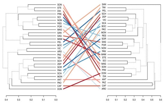 To better visualize the differences between morphological and molecular data in describing diversity, we compared dendrograms. The correlation between the distances obtained with the two datasets (r = 0.18; p > 0.05; Mantel test with 9999 permutations) and the cophenetic correlation between the dendrograms (r = 0.19) were not significant. The tanglegram indicated that the resemblance depicted with the morphological traits did not largely correlate with that obtained with SSR markers (Figure 4).