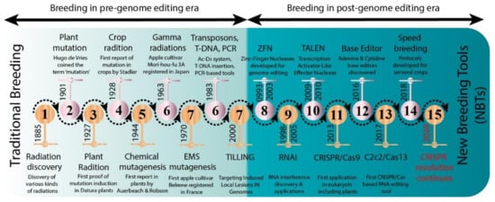 Precision breeding techniques encompass a broad range of technologies that enable the introduction of genetic variation into a plant genome. It combines and utilizes a variety of innovative technologies to engineer desired traits in plants in order to drive new agricultural advancements. In the recent years, the execution of contemporary genome-editing technologies has enabled researchers to easily, swiftly, and economically introduce site-specific modification at the desired DNA sequences in a wide range of cell types and organisms. The CRISPR-Cas based genome-editing technologies can be customized easily to target a desired locus and has brought an unparalleled revolution in agricultural sciences and precision plant breeding [,]. CRISPR-Cas tools can foster crop resilience and reduce chemical crop protection with a strong environmental and public health impact on crop production.