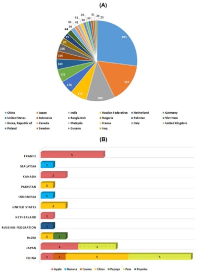 Number of mutant varieties released in top 22 countries (A) and number of mutant tree varieties of assorted fruit species in selected countries (B).