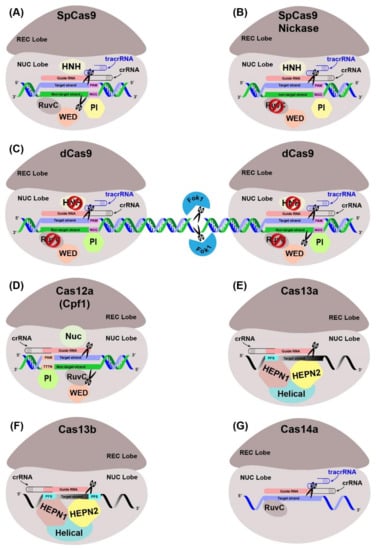 The class II single Cas protein systems are comprised of Cas9 (type II), Cas12 (type V), Cas13a–d (type VI) and Cas14a–c (type V-F) [,]. Among these Cas proteins, Cas9 and Cas12 nucleases target and cleave dsDNA, while different Cas13 (type VI) proteins such as Cas13a (C2c2), Cas13b (C2c6), Cas13c (C2c7) and Cas13d target and cleave the target RNA.