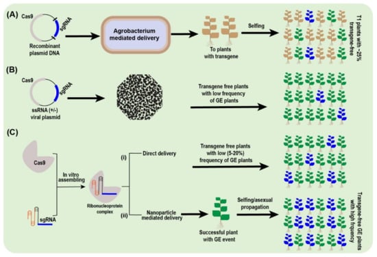 - Sandhya, D.; Jogam, P.; Allini, V.R.; Abbagani, S.; Alok, A. The present and potential future methods for delivering CRISPR/Cas9 components in plants. J. Genet. Eng. Biotechnol. 2020, 18, 25. [Google Scholar] [CrossRef] [PubMed]