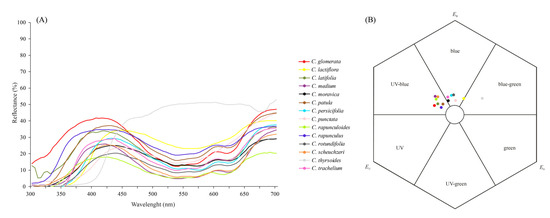 Mean spectral reflectance curves of 14 Campanula species (A) and the corresponding color loci plotted in a hexagon color space against a standard green leaf (B). EU, EB, and EG represent the excitation of the UV, blue, and green bee receptor, respectively. The pairwise distances between the color loci and between each color locus and the uncolored point (center of the hexagon) are given in the online Supplementary Material (Table S1).