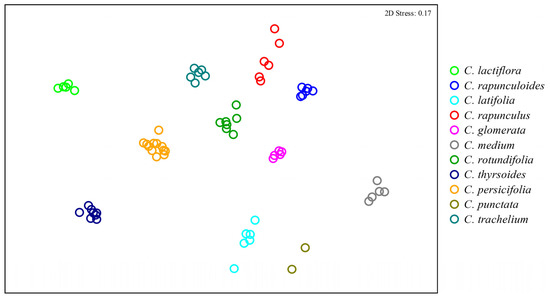 Comparison of floral scent bouquets among 11 Campanula species based on semi-quantitative Bray–Curtis similarities plotted with non-metric multidimensional scaling (NMDS). Samples grouped in a similar manner in the NMDS plot based on qualitative similarities (Figure S1, Supplementary Material).