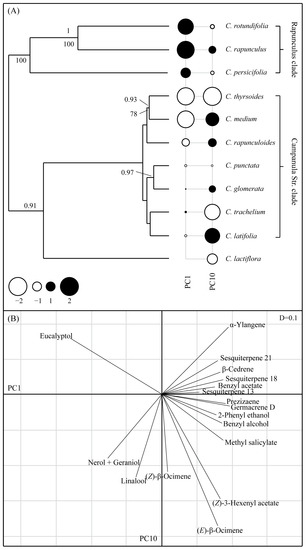 Similar to the results of the pPCA concerning corolla reflectance, neither the Abouheif (Cmean = −0.38, p = 0.997) nor the Pagel’s λ (λ = 0, p = 1) test detected a phylogenetic signal in the local structures (PC10). In the latter structures, eucalyptol and α-ylangene had the highest positive loadings, with (Z)-3-hexenyl acetate and (E)-β-ocimene having high negative loadings (PC10, Figure 4B). The compounds with high (positive or negative) loading values in the PC10 accounted for differences between closely related species. For example, (E)- and (Z)-β-ocimene, linalool, nerol, and geraniol were found in high relative amounts in the flowers of C. thyrsoides but not of C. medium, whereas eucalyptol was produced in high relative amounts in flowers of C. medium, but not in flowers of C. thyrsoides.