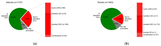Statistics regarding the forms of cpDNA sequences belonging to two major groups of eudicots, asterids, and rosids [48] found in the NCBI database are shown in Figure 1. These two groups account for more than half of the available cpDNA sequences of land plants in the NCBI and annotated with the GeSeq online tool. In both cases, there are a remarkable number of sequences that are not in the standard form (26.8% in asterids, 16.5% in rosids), and the most common deviation from the standard is the different orientation of SSC, followed by cyclic shift.