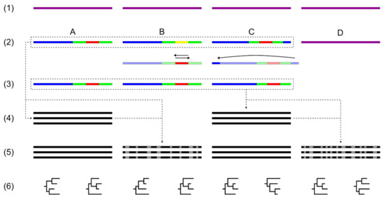 Phylogenetics based on cpDNA can be performed (1) on data of one or more genes (e.g., [40,41]), or (2) on data of whole genomes or data of one or more regions (LSC, SSC, IR; e.g., [42,43,44]). In case (1), extracting gene DNA data does not depend on the form in which sequences are stored, and possible incongruences and conflicts between resulting gene trees were analyzed [25,45,46,47]. For case (2), the form of the stored cpDNA whole genome data can influence phylogenetic analyses input data. To our knowledge, there are no studies of the possible influences of the form of stored cpDNA sequences on the results of phylogenetic analyses.