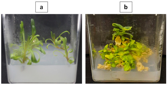 Shoots raised on MS medium (a) Reseda lutea; (b) Reseda pentagyna.