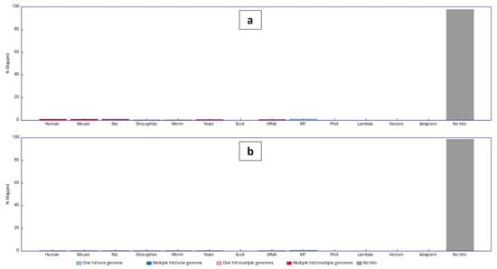- Wingett, S.W.; Andrews, S. FastQ Screen: A tool for multi-genome mapping and quality control. F1000Research 2018, 7, 1338. [Google Scholar] [CrossRef]