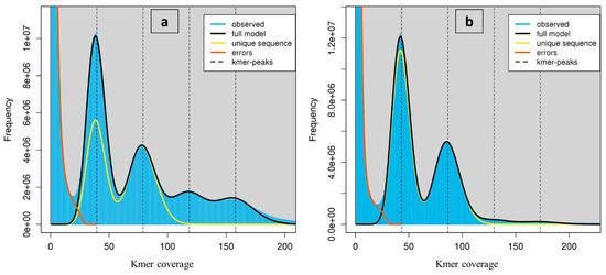 - Ranallo-Benavidez, T.R.; Jaron, K.S.; Schatz, M.C. GenomeScope 2.0 and Smudgeplot for reference-free profiling of polyploid genomes. Nat. Commun. 2020, 11, 1432. [Google Scholar] [CrossRef] [PubMed] [Green Version]