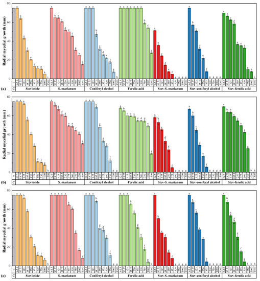 Colony growth measures of (a) N. parvum, (b) D. viticola, and (c) D. seriata strains when cultured in PDA plates containing the various control products (viz. stevioside, S. marianum hydromethanolic extract, coniferyl alcohol, ferulic acid, stevioside–S. marianum, stevioside–coniferyl alcohol and stevioside–ferulic acid conjugate complexes) at concentrations in the 62.5–1500 μg·mL−1 range. The same letters above concentrations indicate that they are not significantly different at p < 0.05. Error bars represent standard deviations.