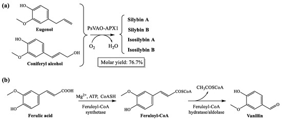 (a) Highly efficient enzymatic cascade engineered for biotransformation of eugenol to silybin and isosilybin. Adapted from [44]. (b) Schematic representation of the non-β-oxidative pathway for conversion of ferulic acid into vanillin, according to [51].