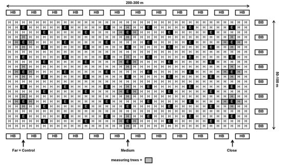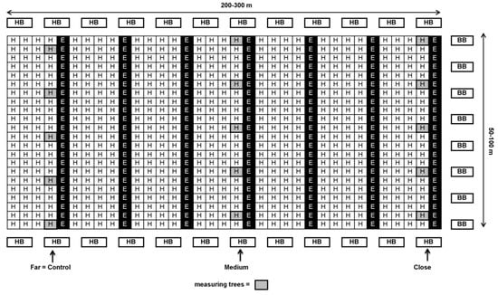 Schematic design of ‘Ettinger’ and ‘Hass’ plot at a 1:4 ratio (Kfar Giladi and Regba) with honeybee (HB) hives at the beginning and end of the rows and bumblebee (BB) hives on only one side of the orchard (right) or on both sides (not shown on the map). Close: 30–100 m; medium: 100–200 m; far: 200–300 m from BB hives.