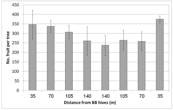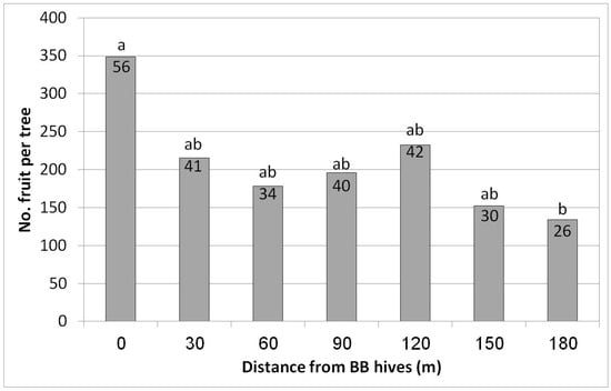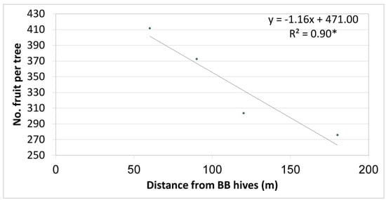 Yield results of the first (preliminary) year depicted a significant negative correlation between the number of fruit per tree and BB hive distances from the row (Figure 3 shows four distances in this year). As such, an average of 410 fruit per tree was obtained in trees located about 60 m from the BB hives, and the number of fruit decreased linearly as the distance increased. An average of 270 fruit per tree was obtained in the farthest row, 180 m from the BB hives (control with no BBs on the trees).