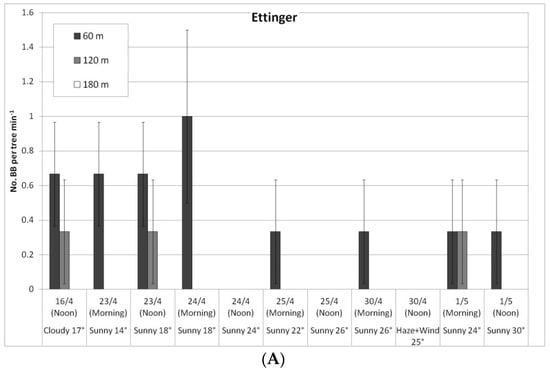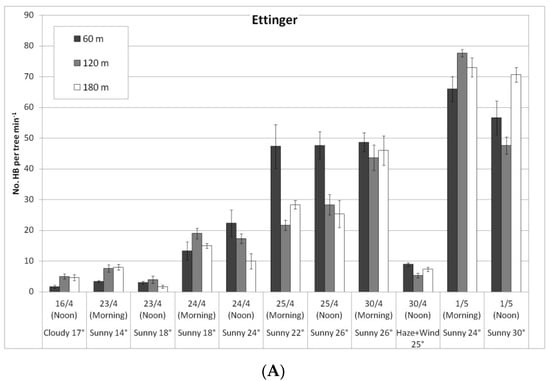 HB and BB foraging activity (number/tree per min) on the selected trees (see Section 2.2) was assessed by an observer who counted the bees on whole trees using a hand-held counter while circling the tree at a distance of approximately 1.0 m for 60 s [5,29,30]. The number of HBs or BBs per tree was measured almost daily throughout the flowering season, usually from 10:00 to 12:00 h, when the bees show peak activity.