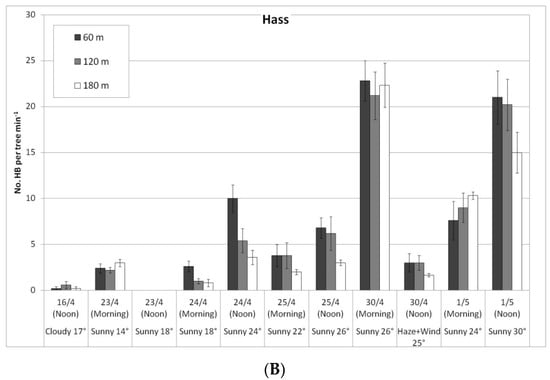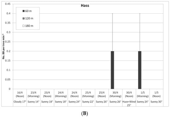 In a comparison of the distances, daily HB activity on the trees was similar for all distances, on both ‘Ettinger’ (Figure 4A) and ‘Hass’ (Figure 4B). However, BB activity differed with distance. The BBs, which were located on only one side of the orchard, were almost always seen only a short distance from the BB hives, and sometimes (only for ‘Ettinger’), even at the medium distance. No BBs were observed at all at the far distance (Figure 5A,B).