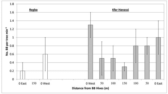 Number of bumblebees (BBs) on ‘Hass’ trees at three distances (Kfar Hanassi, 2 May 2019) or seven distances (Regba, 5 May 2019) from the BB hives. Data are the means of five ‘Hass’ trees at each distance ± SE.