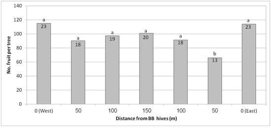 Effect of adding bumblebee (BB) hives (April 2019) on the number of fruit per tree and kilogram of fruit per tree (no. in the column) in February 2020 at seven distances from the BB hives, Eyal, 2019/20. Results in a column followed by different letters differ significantly according to Duncan’s new multiple range test, p < 0.05. Data are the means of five ‘Hass’ trees at each distance.