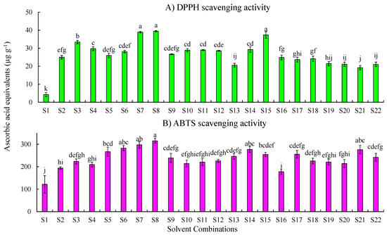 Free radical scavenging activity of cantaloupe extracts measured by the (A) DPPH assay and (B) ABTS assay. Solvent combinations used: S1—water, S2—methanol:water:formic acid (50:45:5), S3—methanol:water:formic acid (50:48:2), S4—methanol:water:formic acid (80:15:5), S5—methanol:water:formic acid (80:18:2), S6—methanol:water(50:50), S7—methanol:water (80:20), S8—methanol (100%), S9—ethanol:water: formic acid (50:45:5), S10—ethanol:water:formic acid (50:48:2), S11—ethanol:water:formic acid (80:15:5), S12—ethanol:water:formic acid (80:18:2), S13—ethanol:water (50:50), S14—ethanol: water (80:20), S15—ethanol 100%, S16—acetone:water:formic acid (50:45:5), S17—acetone:water:formic acid (50:48:2), S18—acetone:water:formic acid (80:15:5), S19—acetone:water:formic acid (80:18:2), S20—acetone:water (50:50), S21—acetone: water (80:20), and S22—acetone (100%). Results are represented as mean ± SE (µg g−1) ascorbic acid equivalents. Means with the same letters indicate no significant differences (p ≤ 0.05) among the solvent combinations.