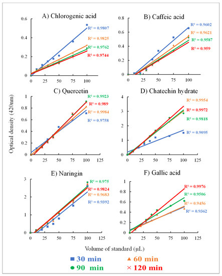 Reaction rate and incubation times evaluated using the optimized FB assay on standards. Linear regression lines were plotted to obtain R2 at four-time points. Phenolic standards: (A) chlorogenic acid, (B) caffeic acid, (C) quercetin, (D) catechin hydrate, (E) naringenin, and (F) gallic acid. Absorbance was read at 420 nm with kinetic readings. All standards concentrations were 250 µg mL−1 and alkali medium KOH (1 N) and 0.01% FB assay solution was used for the assay.