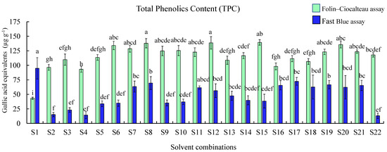 Total phenolic content measure by the Folin–Ciocalteu and Fast Blue assay in cantaloupe extracts. Solvent combinations used S1—water, S2—methanol:water:formic acid (50:45:5), S3—methanol:water:formic acid (50:48:2), S4—methanol:water:formic acid (80:15:5), S5—methanol:water:formic acid (80:18:2), S6—methanol:water (50:50),S7—methanol:water (80:20),S8—methanol 100%, S9—ethanol:water: formic acid (50:45:5), S10—ethanol:water:formic acid (50:48:2), S11—ethanol:water:formic acid (80:15:5), S12—ethanol:water:formic acid (80:18:2), S13—ethanol:water (50:50), S14—ethanol: water (80:20), S15—ethanol 100%, S16—acetone:water:formic acid (50:45:5), S17—acetone:water:formic acid (50:48:2), S18—acetone:water:formic acid (80:15:5), S19—acetone:water:formic acid (80:18:2), S20—acetone:water (50:50), S21—acetone:water (80:20), and S22—acetone 100%. Results are represented as mean ± SE (µg g−1) gallic acid equivalents (GAE) for each solvent, different letters indicate significant differences (p ≤ 0.05) among the solvent combinations.