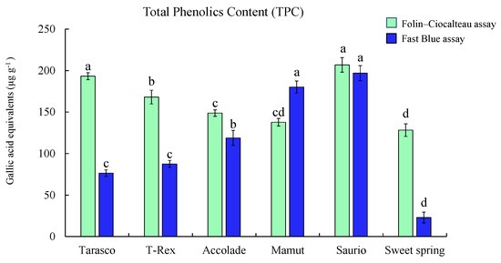 Our results demonstrate that the optimized assay can be applied to accurately measure TPC in melon varieties (Figure 4). Results show the Saurio variety with higher TPC measured by the F–C assay (206.75 ± 8.79 µg g−1 gallic acid equivalents (GAE)) compared to the FB assay (196.88 ± 9.00 µg GAE g−1), followed by the Tarasco variety, which also showed higher TPC measured by the F–C assay (193.16 ± 4.21 µg GAE g−1) than the FB assay (76.45 ± 4.06 µg GAE g−1).