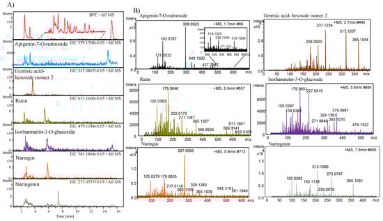 Six phenolics derivatives were identified and their total ion chromatogram, extracted ion chromatogram, and tandem mass spectra are presented in Figure 5A,B. A peak eluted at a retention time (RT) of 1.7 min with m/z 579.1906 [M + H]+ is identified as apigenin-7-O-rutinoside based on the mass spectra and by the literature [7]. Another peak that eluted at a RT of 3.7 min was identified as gentisic acid-hexoside isomer 2 (m/z 317.1207 [M + H]+) as previously reported in melon extracts [30]. Similarly, a peak eluted at 5.5 min at RT representing the molecular ion peak at m/z 611.1606 [M + H]+ was identified as rutin. Two peaks that eluted at a RT of 5.5 and 5.9 min were identified as isorhamnetin-3-O-glucoside and naringin, having a molecular ion peak at m/z 479.1184 [M + H]+ and m/z 581.1864 [M + H]+, respectively. A peak at RT 7.4 min displayed a molecular ion peak at m/z 273.0757 [M + H]+ and was identified as naringenin and previously reported by [7].