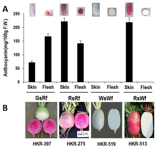 Radish (Raphanus sativus L.; Brassicaceae) is an economically important root vegetable cultivated worldwide for its edible taproots, sprouts, and seed oil. Taproots of radish contain dietary fiber, carbohydrates, and essential minerals and nutrients that benefit human health [1]. In addition, red radishes contain significant amounts of anthocyanins, phenolics, and flavonoids, which contribute substantially to their antioxidant activity [1,2,3]. Radish taproots typically display four types of color patterns: red skin with red flesh (RsRf), green skin with red flesh (GsRf), red skin with white flesh (RsWf), and white skin with white flesh (WsWf).