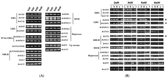 The presence of anthocyanin biosynthesis-related genes was determined by PCR (Figure 2A), and their expression in different organs or tissues was examined by semi-quantitative RT-PCR (Figure 2B). Even though the transcript level of EBGs, such as RsCHS, RsF3H, and RsF3′H, was highly expressed in flesh tissue of Rf compared to Wf. The expression of target genes of the MBW complex formed by RsTT8 (RsMYB and RsTTG1), such as RsDFR and RsLDOX genes, was consistent with anthocyanin accumulation.