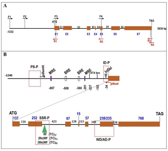 Schematic representation of genomic DNA of RsTT8 genes with primer position for cloning (A) and genomic organization of cloned RsTT8 genes (B). (A) Exon and intron are represented by box and solid line, respectively. I and E indicate intron and exon, respectively. Arrows indicated primer position and direction with forward (F) and reverse (R). (B) Genomic organization of cloned RsTT8 genes with promoter regions and 7 exons (box) and 6 introns (solid line). Numbers indicated nucleotide sequence (bp), and InDel and SSR regions were also marked. MRE, MYB-recognition motif; BRE. bHLH-recognition motif. Arrows named pBamHI and pNcoI indicated primers for promoter::GUS construction. Four boxes of dotted red lines indicate regions used in marker validation: PS-P, region amplified by promoter-specific primer set (−979~−818) (Rf-P/Wf-P in Table S1); ID-P, region amplified by 14 bp InDel-discriminating primer set; SSR-P, region amplified by TC SSR including primer set; WD/AD-P, region amplified by primer set that discriminated one CAT InDel and three SNPs (Rf/Wf-P in Table S1).