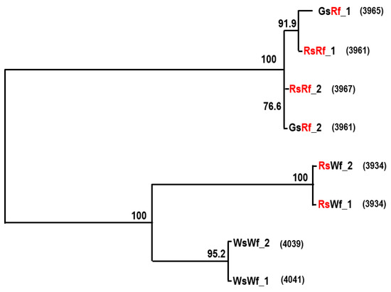 The RsTT8 gene was isolated from all four radish inbred lines using gene-specific primers (Table S1), which were designed based on the sequence information available in various databases (see Materials and Methods). The sequence of at least 10 independent RsTT8 clones per genotype was analyzed to identify putative paralogs. Primer positions and RsTT8 gene structure are shown in Figure 3A. Nucleotide sequences of RsTT8 amplified from the different inbred lines and their alignment are shown in Figure S1. On the basis of sequence information, a schematic of the genomic structure of RsTT8 was redrawn to show several important residues or regions (Figure 3B). Several polymorphisms, such as SNPs, InDels, and SSRs, were identified between red-fleshed and white-fleshed radish lines (Figure S1, Table 1). An InDel immediately upstream of the transcription start site (TSS) and a dinucleotide (TC) SSR at the beginning of intron 2 were detected between red-fleshed and white-fleshed lines (Figure 3B). Phylogenetic analysis of RsTT8 nucleotide sequences clearly distinguished the red-fleshed lines from white-fleshed lines (Figure 4), suggesting that radish germplasm used in this study are inbred lines (not doubled haploid lines), and RsTT8-Wf alleles are distinct from RsTT8-Rf alleles. However, polypeptides encoded by RsTT8 genes amplified from all four inbred lines were well conserved (Figure 5), suggesting that the different anthocyanin accumulation levels among the four inbred lines are caused by differences in RsTT8 expression levels.