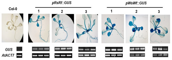 To analyze the RsTT8 promoter activity, the approximately 870-bp sequence upstream of the TSS of the RsTT8 gene was amplified from the genomic DNA of WsWf and RsRf inbred lines using sequence-specific primers (Table S1). The amplified fragments were inserted into the T&A cloning vector (Real Biotech Co., Taipei, Taiwan), and the presence of the insert was confirmed by sequencing. The resulting recombinant plasmids were digested with BamHI and NcoI, and the released fragments were subcloned into the pCambina3301-GUS binary vector digested with the same enzymes. The resulting constructs were introduced into Arabidopsis thaliana ecotype Columbia (Col-0; wild type) plants by Agrobacterium-mediated transformation using the floral dip method [50]. The transformed plants were selected using 0.1% Basta herbicide and confirmed by PCR. Homozygous T3 lines containing a single copy of the T-DNA, determined by 3:1 (Basta resistant: sensitive) segregation ratio, were selected for the analysis of promoter activity.