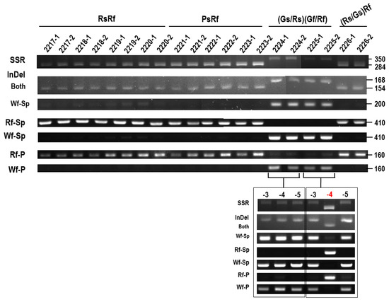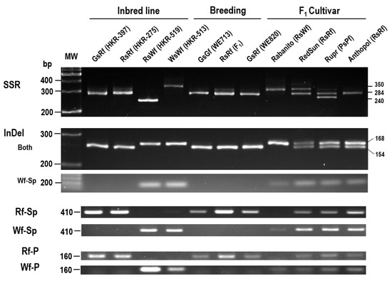 Development of PCR-markers derived from polymorphisms (SSR, InDel, and SNPs). (TC)-SSRs were present in the 2nd intron ranging from (TC)13 to (TC)68. InDel was 14 nucleotide insertion in Wf gene and present at the 35th nucleotide of ATG upstream. Rf-Sp and Wf-Sp indicated that Rf-specific and Wf-specific amplification, respectively, which was designed using CAT InDel in 5th intron and SNP in exon 6. Rf-P/Wf-P indicated SNPs presented in the promoter regions between −979 to −818 nucleotide from ATG start codon. Primer sequences were listed in Table S1. Numbers on the right denoted size of band (bp).