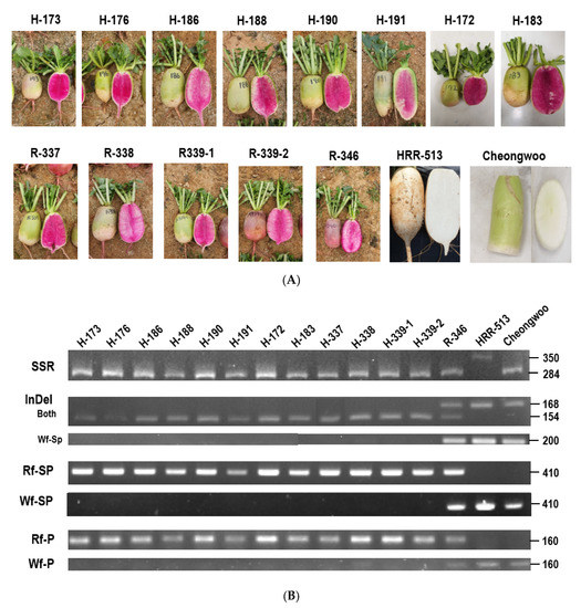 Validation of PCR-markers using F1 cultivars in Korea. H and R indicate inbred and recombinant lines, respectively, from Hankook Seed Co. Numbers on the right, denote size of band (bp). (A) Morphology of taproots used in this study. (B) Results of PCR amplification.