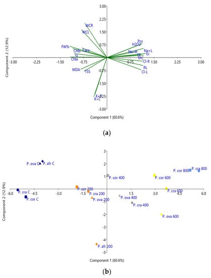 - Koyro, H.W. Effect on salinity on growth, photosynthesis, water relations and solute composition of the potential cash crop halophyte Plantago coronopus (L.). Environ. Exp. Bot. 2006, 56, 136–146. [Google Scholar] [CrossRef]