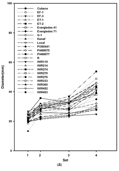 Significant differences in the germplasms in terms of the stem, nodes, and shoot tip were found, except in the stem and nodes of plants in Set 2 (Table 3). The lack of differences in all replications implies that the data were consistent and reproducible. However, the rank of each trait did not remain the same (Figure 1, Table 4, Table 5 and Table 6). Although the rank of each trait was similar in the majority of germplasms, some of them decreased or increased dramatically. This strongly indicates that the selection must be performed at the end of the growth stage. In addition, differences in the germplasms of different tissues at different time points suggest that the growth rate of each germplasm is different in different environments, which could be worth examining.